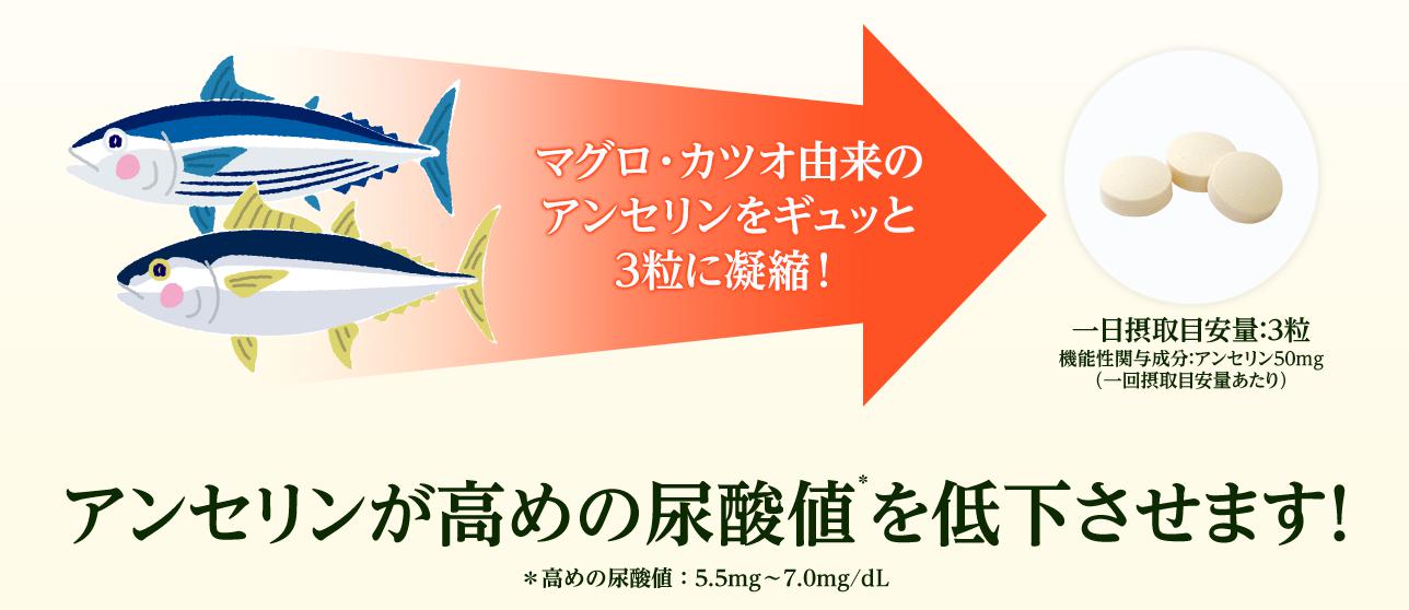 尿酸値を低下させる機能があることが、臨床試験で確認されている機能性関与成分『アンセリン』を配合。特に評価が高いマグロ・カツオ由来のアンセリンを3粒に凝縮しています。