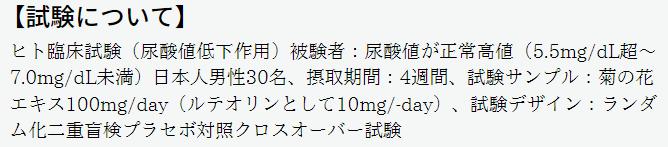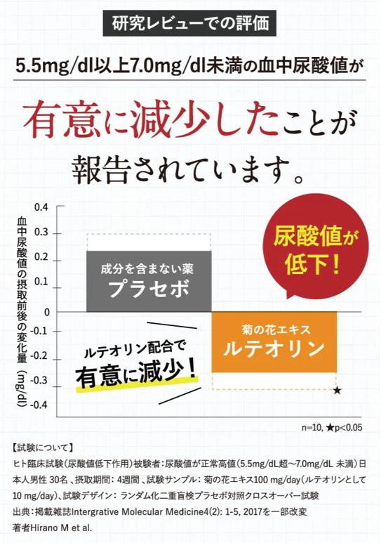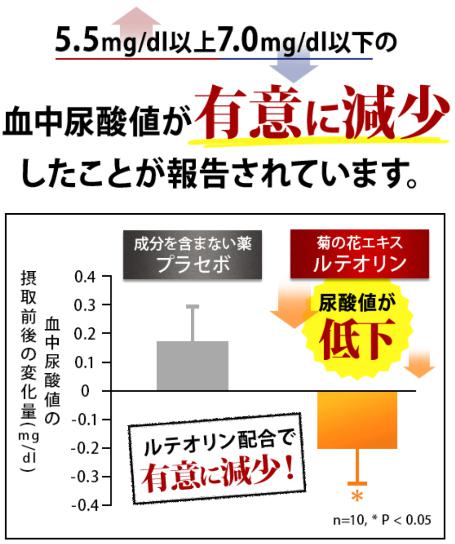 プリン体が尿酸に変わるプロセスをW阻害してくれる『ルテオリン』を配合。血清尿酸値が5.5mg/dL超〜7.0mg/dL未満の男性によるヒト試験結果で、4週間の継続接で血中尿酸値が有意に減少したことが報告されています。