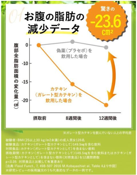 ガレート型カテキンには肥満気味の方のお腹周りの脂肪(内臓脂肪、皮下脂肪)を減少させ、体重の減少をサポートし、高めのBMIを低下させる機能があることが報告されています。